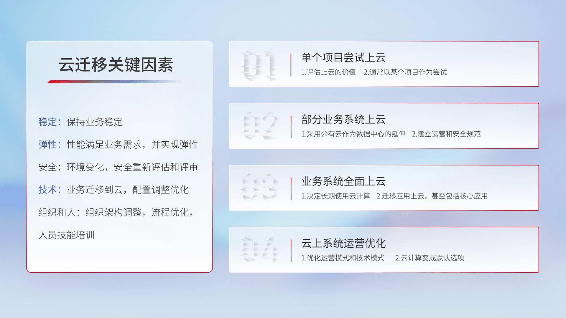 结合实际业务,,从规划设计、、、、云平台选型、、、、云原生改造、、数据迁移、、、、集成交付,,,迁移全过程为客户识别最佳上云路径,,,,做好风险识别管理,,,,设计网络架构、、身份权限、、安全审计合规、、、、操作审计、、、、日志审计、、、监控告警策略、、、多站点容灾设计等,,对云上基础设施进行整体规划,,提升IT治理水平,,以满足弹性、、、、高可用、、、、高性能的需求。。。。