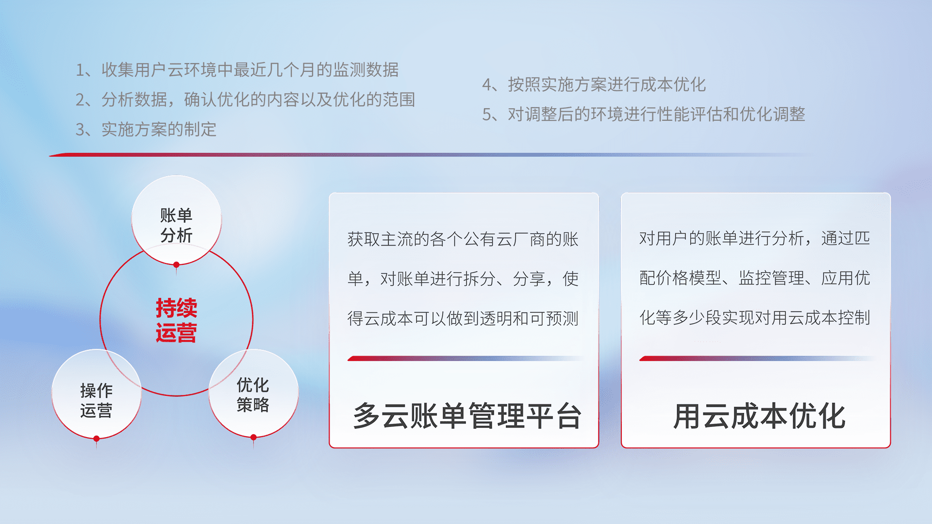 通过灵活运用多种自动化迁移工具,,,帮助企业用户实现业务和数据高效 、、、稳定的上云迁移和云上迁移,,,,采用自研多云纳管平台,,,以中立管理模式,,,,解决多组织、、、、多云、、、、多运维厂商的复杂关系的管理,,,,保证多云平台资源配置的一致性,,,,实时掌控云资源运行数据,,,,运用智能化工具分析云资源多云平台的管理服务,,,透明化管理成本支出,,,,用云成本可预测、、、、用云费用可优化、、云资源配额有据可依。。。