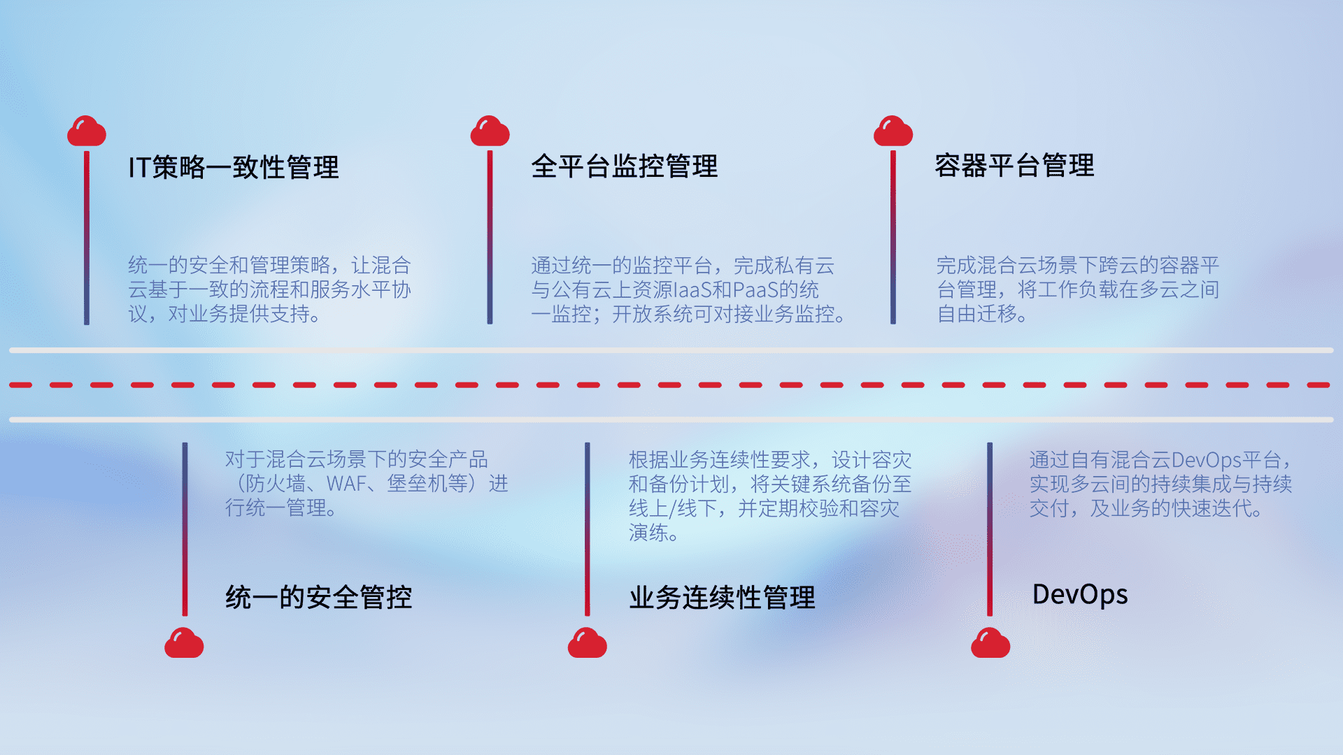 通过多云纳管,,,以统一的资源数据模型把客户的云资源进行抽象和封装,,进而实现对多云资源的统一操作,,保障云资源管理的可靠性、、、稳定性与可用性。。。。量身定制化运维内容,,配置、、、开发运维、、补丁管理、、、、备份、、监控、、、、认证和访问管理、、审计和日常巡检等,,,保障在用云过程中的可靠度,,,,稳定度以及高可用率。。。。