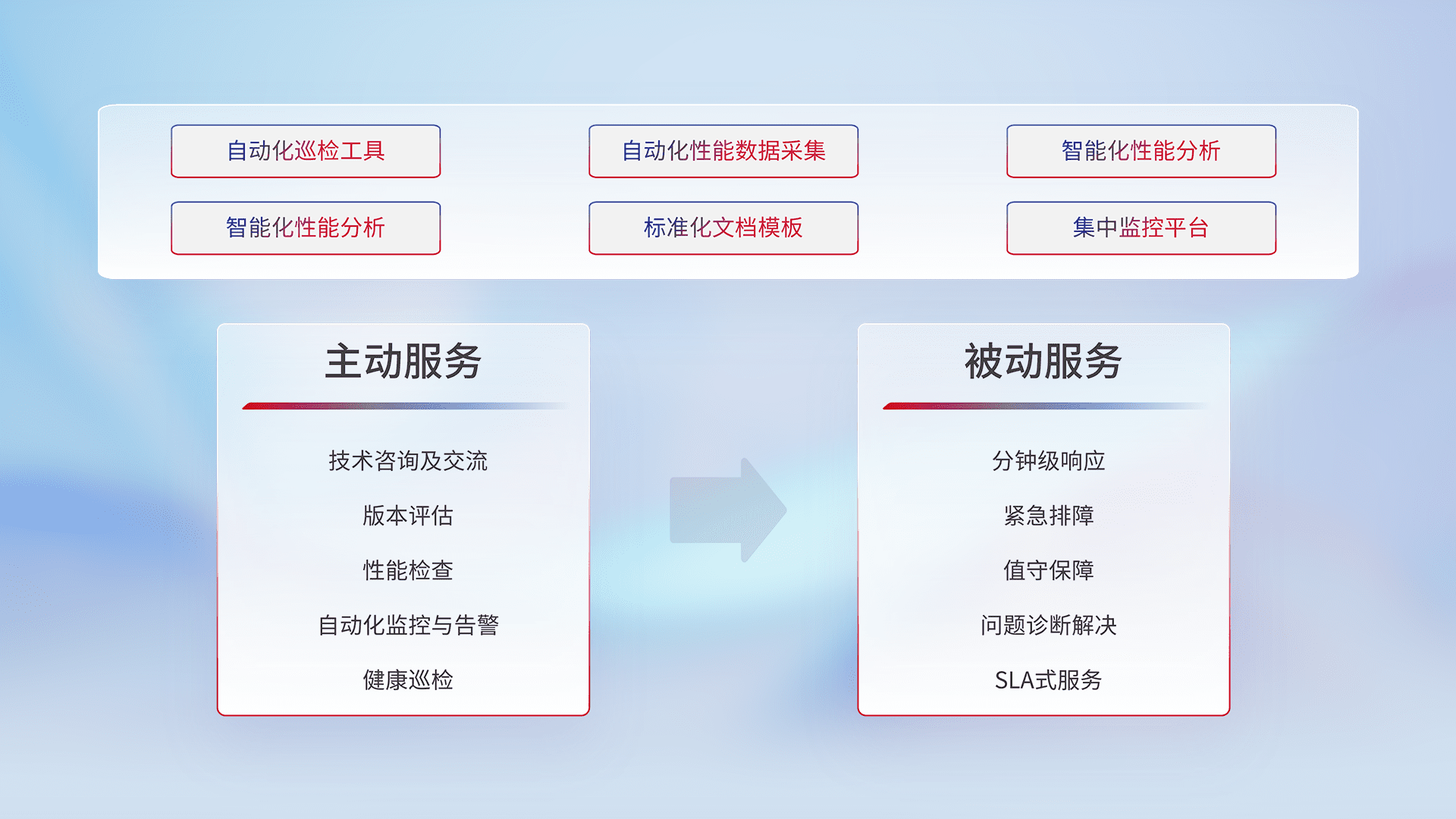 智能化工具和标准化文档,,,保障服务质量,,,提供主动服务(包含技术咨询、、版本评估、、性能检查、、、自动化监控与告警、、、健康巡检)和被动服务包含(分钟级响应、、、、紧急排障、、、值守保障、、、、问题诊断解决、、、、SLA服务)。。。。